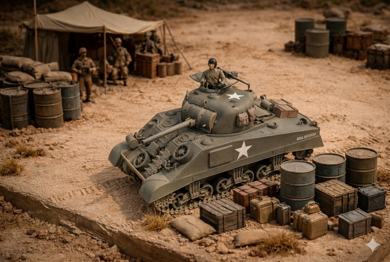 今回のジオラマ画像は背景をChatGPTに作ってもらい、シャーマン戦車の埋め込みはGeminiに頼みました。chatGPTに埋め込みを依頼すると、どこかから勝手にシャーマン戦車の画像を持ってきてはめ込みますので、使えませんでした。Geminiは提供した画像をはめ込んでくれましたが、もう少し大きくして中央にしてほしいといっても、この画像ではできませんと拒否されました。それぞれ得意不得意があるようですね。このためドラム缶などとのスケールが合っていません。