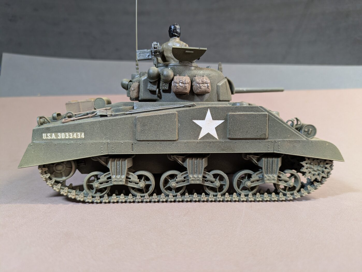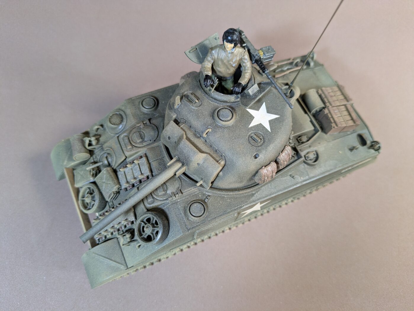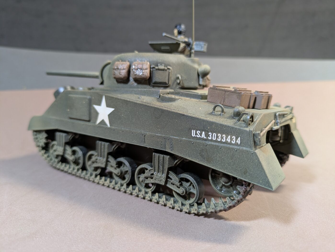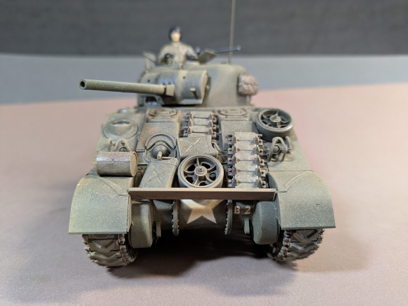 塗装ですが、今回は勉強のためchatGPTに相談しながら進めました。設定は北アフリカ戦線で前線から帰還した直後のM4シャーマンです。ラッカーのグレーサフを全体に塗布後、仕上がりイメージとしては、