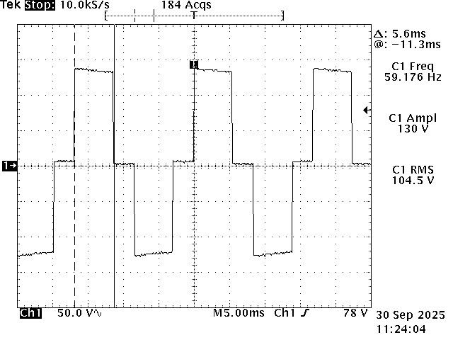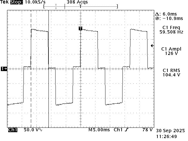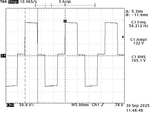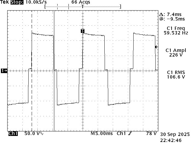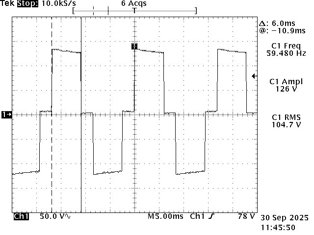 まず無負荷の場合です。このように疑似正弦波です。この場合ON期間が4.8msで、0V区間が両側に3.4msあります。あくまでもオシロの表示ですが、上のように波高140Vくらいで、実効値が105Vとなりました。周期は約16.4msで周波数は約60Hzです。無負荷での入力電流は0.34Aでした。無負荷時の消費電力は約4Wです。