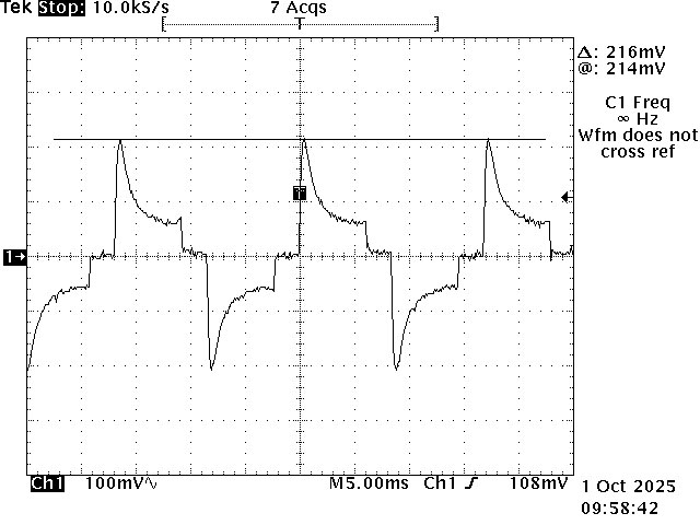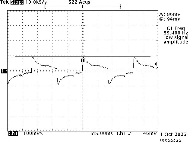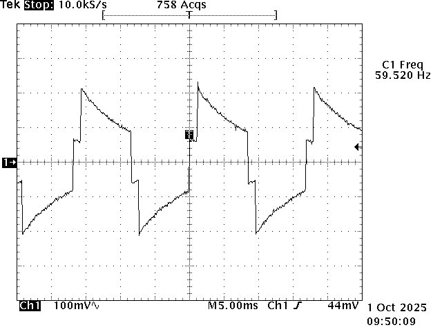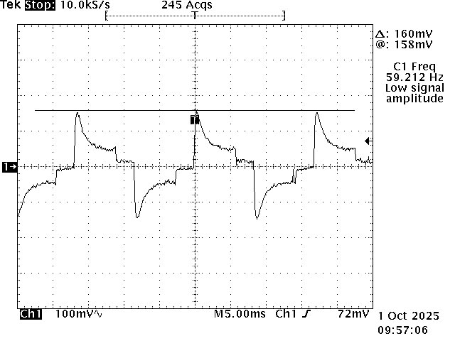 次に軽負荷のラジカセですが、上のように波高132Vくらいで、実効値が105Vとなりました。ON期間は約5.3mSとなり無負荷よりすこし広がりました。入力電流は0.48Aでした。負荷が加わると実効値を維持するために少しON期間が広がるようです。ラジオの受信音にノイズがまざるようなことはありませんでした。