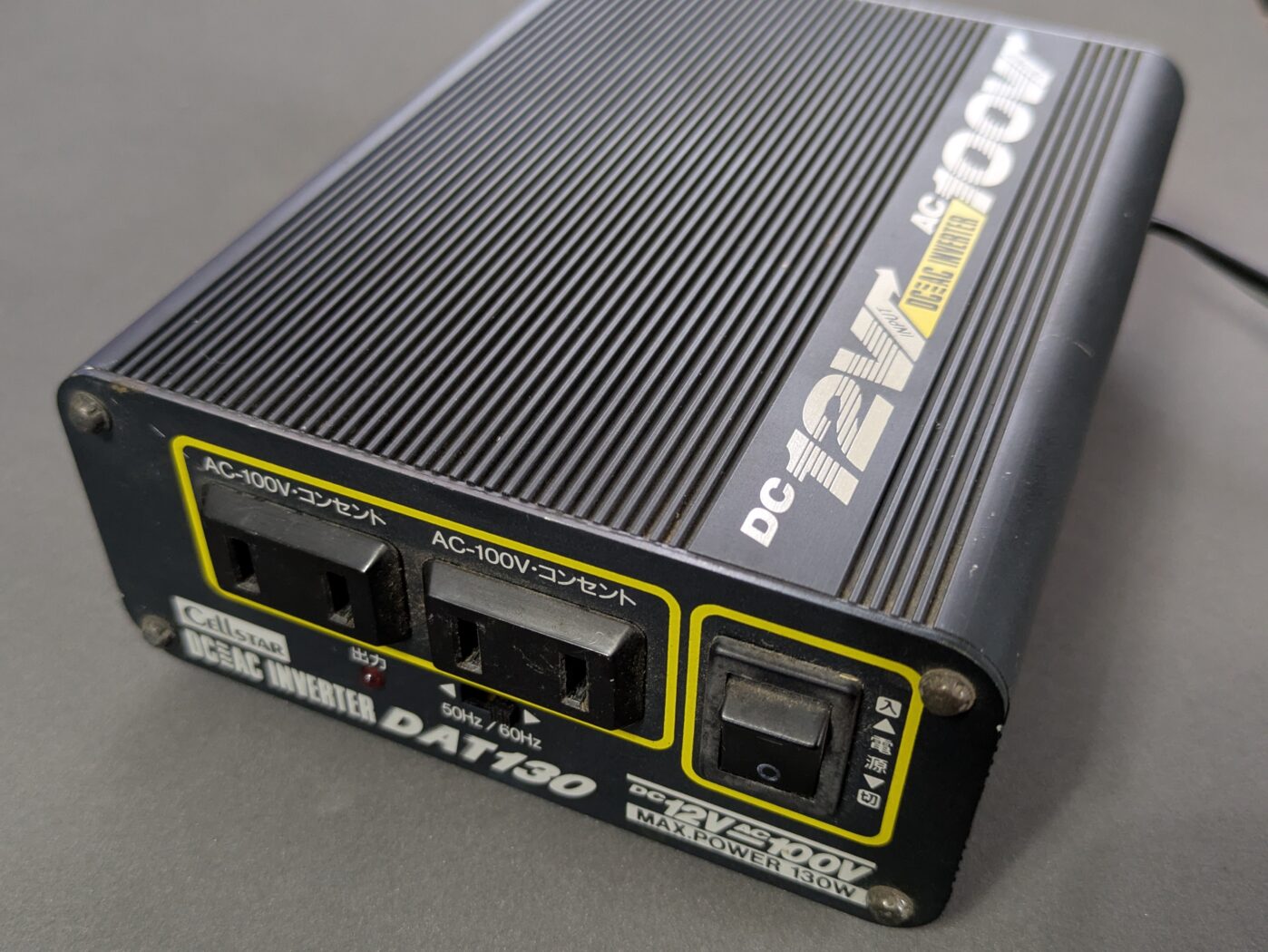 その頃はまだ純正弦波出力のDC-ACインバーターはかなり高価で、なかなか手が出なかったように思いますが、このインバーターのように疑似正弦波(修正正弦波)出力であっってもAC 100Vが使え、価格も手ごろとあって、ずいぶんもてはやされていたように思います。小型で手ごろなものがたくさん販売されていました。今回のインバーターはDC12V入力 AC 100Vrms(50/60Hz)疑似正弦波出力 130Wインバーター DAT130です。