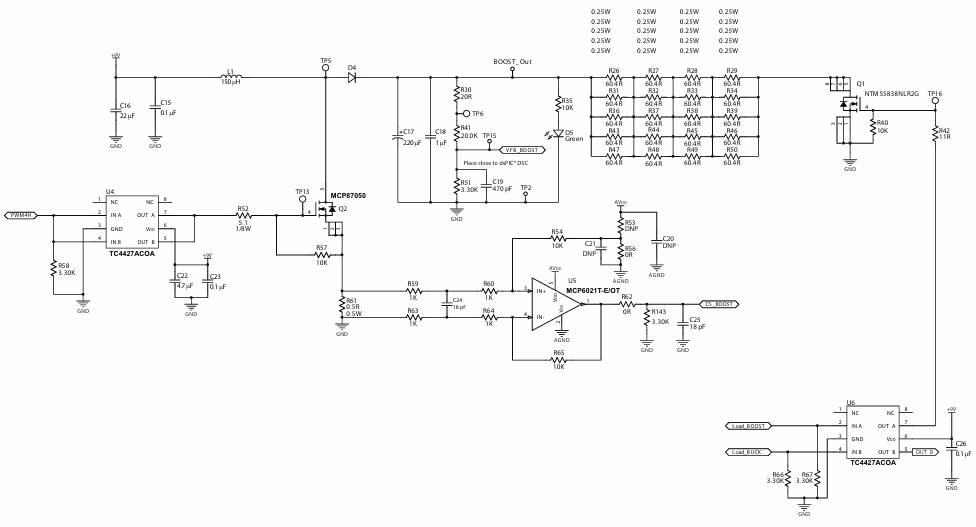 昇圧コンバータはオーソドックスな回路です。パワーMOSFETは降圧コンバーターと同じMCP87050です。ゲートドライバーはMicrochip社のデュアル・ハイスピード・パワーMOSFETドライバーTC4427ACOAで、1.5A のデュアル・ハイスピード・パワーMOSFETドライバーです。二組の非反転タイプ電流増幅回路ですがパラレルにして使用しています。ゲート抵抗は5.1Ωです。LとCは150uHと221uFで共振周波数は2.76KHzと計算できます。スイッチング周波数はそれより十分高い350KHzです。ドレイン電流はソース側のシャント抵抗0.5Ωで検出し、レールツーレールOPアンプのMCP6021Tを差動アンプにして増幅しています。これは過電流検出用です。出力側の電圧は抵抗分圧して制御側のADコンバーターにフィードバックしています。負荷として抵抗群がつながっています。合成抵抗値は2.192Ωです。その先(右端)のパワーMOSFETは負荷抵抗に流す電流を決める、いわば簡単な電子負荷で、降圧レギュレータと同じNTMS5838NLR2Gが使われています。電子負荷のゲートドライバーにはTC4427ACOAが使われています。一方の出力は降圧コンバーター側のNTMS5838NLR2Gをドライブしています。