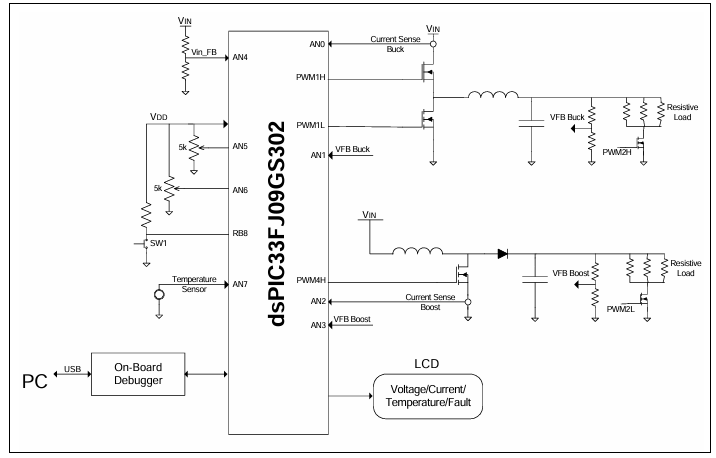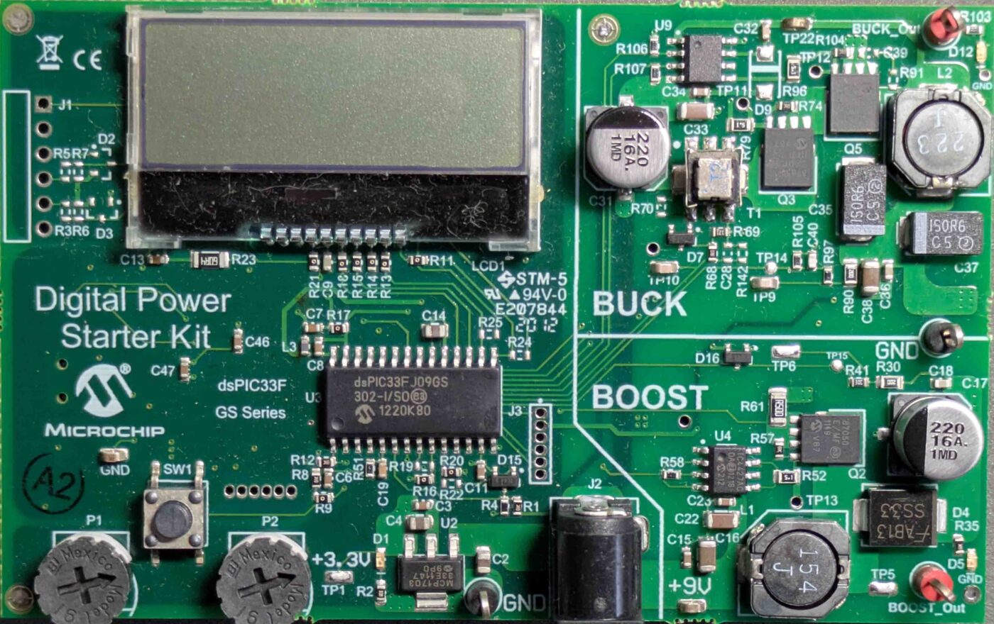 デジタル制御電源はDC-DCコンバーター等、いわゆるスイッチモード電源(SMPS)のパワー回路には従来のパワーMOSFETのスイッチング回路やそのドライバー、インダクタやキャパシタ等が使われますが、それらの制御にはデジタル信号コントローラ(DSC)としてマイコンが使われます。つまりパワー回路以外はマイコン処理のデジタル制御になっています。各社からデジタル制御電源用マイコンが提供されていますが、Microchip社のdsPIC33FJXXGSXXXシリーズはそれにあたります。GSは電源制御用のPICマイコンであることを示します。DM330017ではdsPIC33FJ09GS302が搭載されています。(ちなみにdsPIC33FJXXMCXXXはモーター制御用、dsPIC33FJXXGPXXXは汎用です)