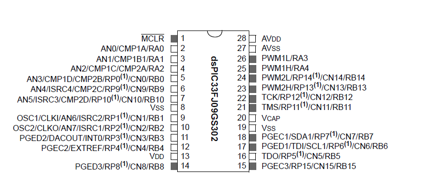 上は28ピンのdsPIC33FJ09GS302のピン配置です。デジタル側の電源Vddとアナログ側の電源AVddがあります。PWMジェネレーターはPWM1、PWM2、PWM4の3つありますが、PWM4の出力PWM4HとPWM4Lは標準では出ていませんのでピンリマップが必要です。PWM1のPWM1HとPWM1L、PWM2のPWM2HとPWM2Lはそれぞれ出ています。ADコンバーターの入力は8チャネル(AN0,1,2,3,4,5,6,7)あります。