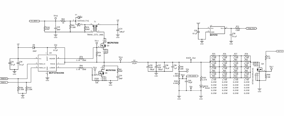 降圧コンバーターはパワーMOSFETを二個使った同期整流型です。出力電圧は3.3Vです。パワーMOSFETにはMCP87050を使用しています。高速スイッチング用でVdss 25V、Id 1100A、Vgs 1.3V、Rds 5mΩという規格です。ゲート・ドライバーMCP14700はデュアル入力同期式MOSFETドライバーです。ハイサイドにブートストラップ回路が内蔵されています。デュアル入力ということは、デッドタイム生成回路は内蔵していません。このため制御側からデッドタイムのある相補PWM信号を与えなければなりません。ゲート抵抗は5.1Ωです。LとCは22uHと323uFですので共振周波数は1.89KHzと計算できます。スイッチング周波数はそれより十分高い350KHzです。出力電圧は抵抗分圧して制御側にフィードバックしています。負荷として抵抗群がつながっています。合成抵抗値は48.32Ωです。その先(右端)のパワーMOSFETは負荷抵抗に流す電流を決める、いわば簡単な電子負荷で、NTMS5838NLR2Gが使われています。これはONセミのパワーMOSFETでVd 40 V, Id 7.5 A, Rds 20 mΩというものです。Vgsは1.8Vです。ハイサイドのパワーMOSFETのドレイン電流をカレントトランスでCST2-060Lで検出しています。これは過電流検出用の回路です。右上のMCP9700は抵抗負荷の温度を計測する温度センサーです。過熱保護用です。