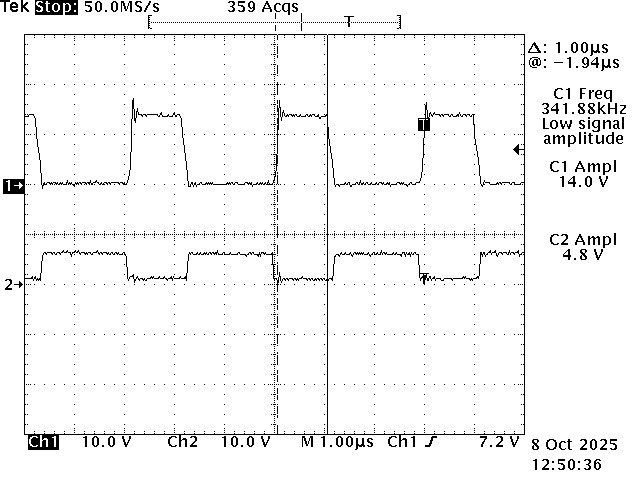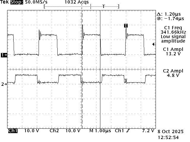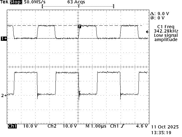昇圧コンバーターはパワーMOSFETが1個なのでPWM信号は完全独立出力PWMモードが使われています。スイッチング周波数は350KHzです。