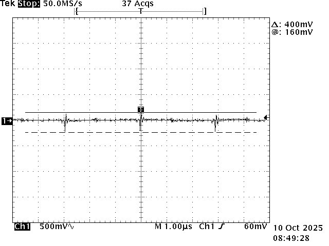 降圧コンバーターの最大負荷時(1.49A)の出力電圧です。2.8uS毎(350KHz)にリプルがあります。スペックでは50mVppですが、実測では400mVppもあります。先のパワーMOSFETのハイサイド・ゲート信号のサージが影響しているものと思われます。