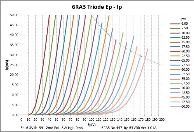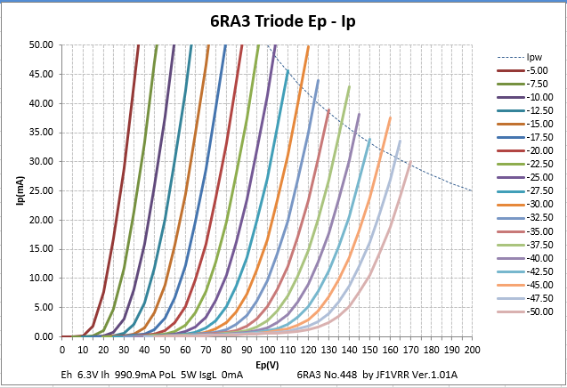 以下は6RA3 2本(管理番号447、448)の実測Ep - Ip特性、実測三定数です。(三定数はあまり精度はありません)
