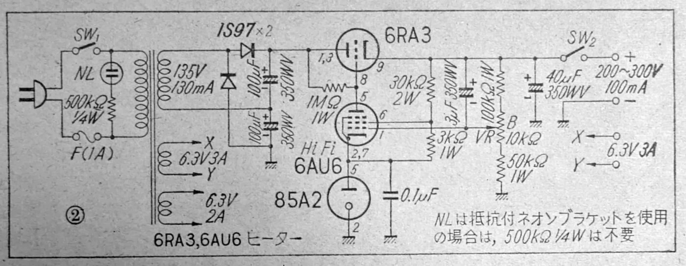 この記事は定電圧放電管(電圧標準管)85A2(0G3)を紹介する記事ですが、真空管を使用した可変高圧定電圧電源としては面白い記事です。真空管式のオーディオ・アンプや無線機のB電源、いわゆる真空管のプレートに印加する電圧を作る電源回路は、機器に個別に組み込まれ、一般的には200Vから350Vくらいの高圧です。いろいろ作っていると個々に電源を組み込むのは不経済と思えてきます。そこで200Vから350Vくらいまで可変できるB電源と、ヒーター電源(6.3Vや5Vなど)を供給する電源装置をひとつ作っておけば汎用的に使えます。そのような要求を満たすのがこの記事の高圧可変定電圧電源です。