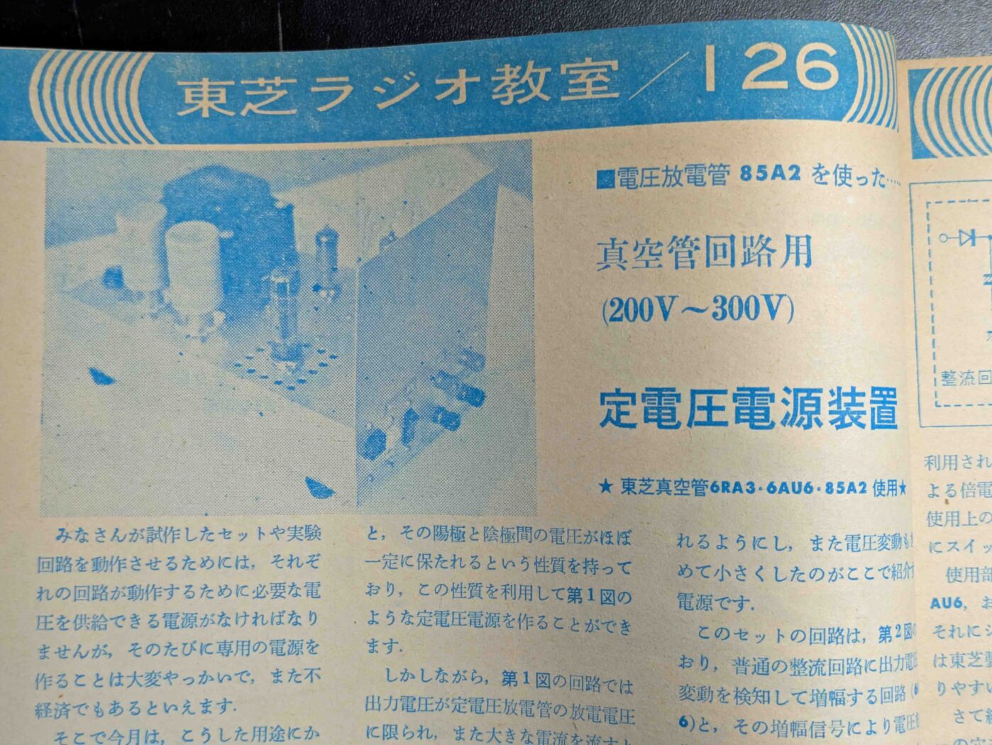 使用例としてはオーディオ・アンプで見られます。この球の内部抵抗の低さをかってOTLアンプを構成するようです。電源に使用している例を探してもなかなか出てきませんが、古い初歩のラジオで見つけたのが以下の記事です。1968年11月号の東芝の真空管やトランジスタ等のPRページ「東芝ラジオ教室」です。このころの初歩のラジオには東芝のほか、松下電器やNECなどがこのような自社製品のPRのための製作記事を掲載しており、簡単に作れて実用的な回路が紹介されていました。とても参考になりました。
