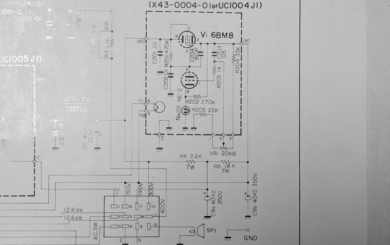 上はトリオのHFトランシーバーの電源回路の一部です。6BM8が使用された定電圧回路です。この回路は先の6RA3使用の回路とほぼ同じですが、定電圧放電管は使用せず、代わりにネオン球の放電を利用しています。このほうが安上がりですね。この回路では6BM8の三極部がエラーアンプで、五極部を三結にして抵抗管として使用しています。ネオン球は昔の電気機器でよく電源のパイロット・ランプとして使われたものと同じと思われます。これは70Vから80Vくらいの定電圧特性を持つものと推測します。回路の動作原理は6RA3の回路と同じです。TS-511はこの回路で安定した150Vを作り、発振回路などで使用しています。