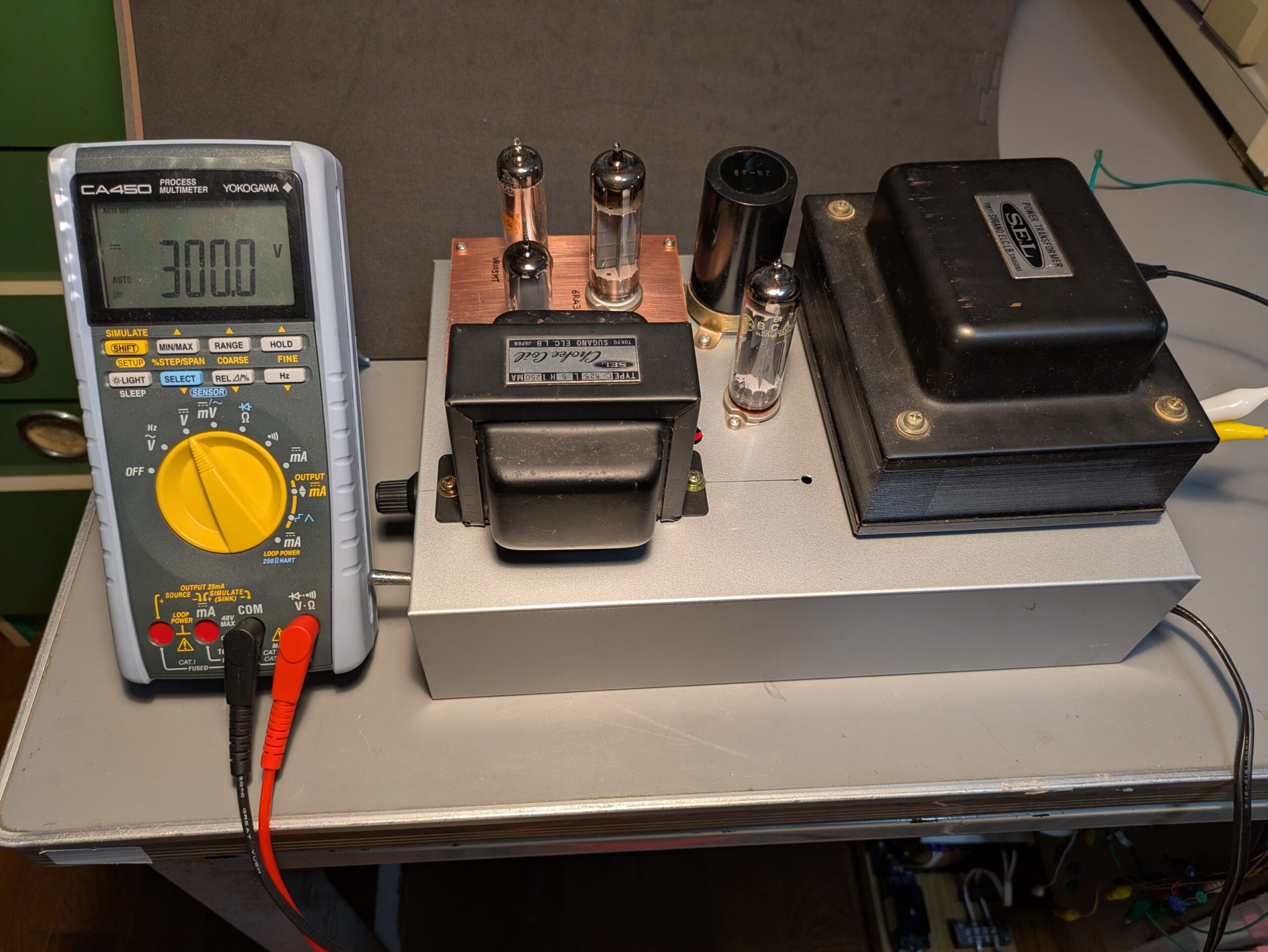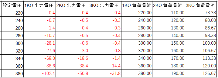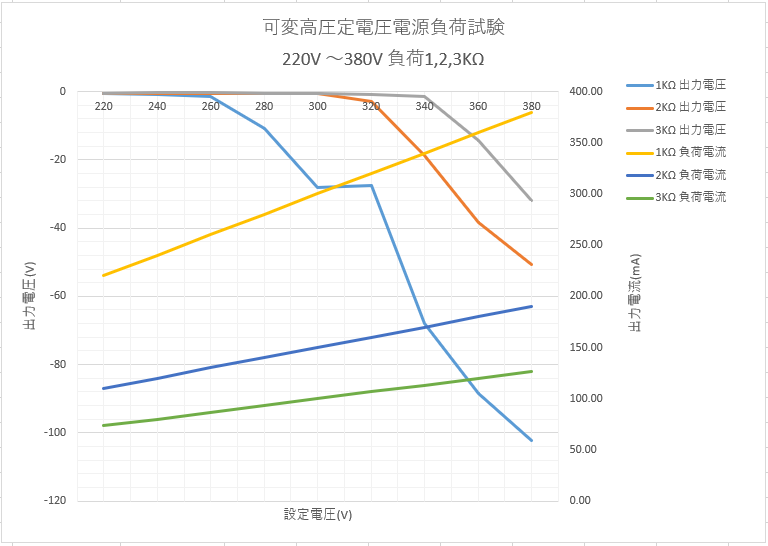 負荷試験の結果、この電源は負荷電流100mA程度で出力電圧220Vから340Vくらいまでが実用範囲と思われます。このような可変高圧電源をひとつ用意しておけば何かと便利かと思います。