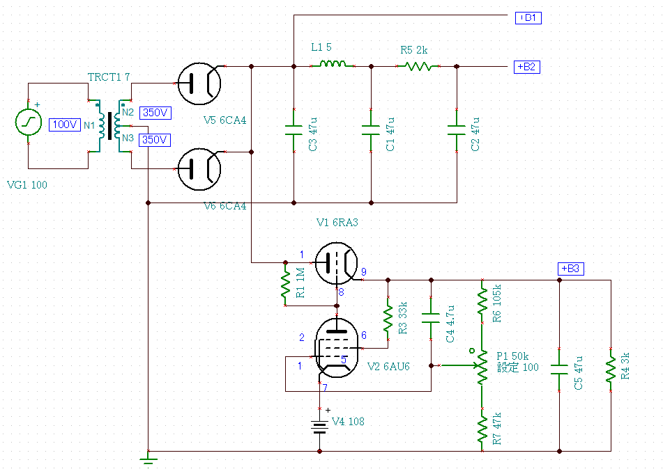 回路は標準的なもので、電源トランスは菅野電機(SEL)のSD-200Eです。二次側は350V - 200mA - 350V、6.3V 3A x 2、5.0V 3A x1 となっています。47uFで平滑しただけの出力を+B1、47uFと5KΩのパイ型フィルターで少し電圧降下させた出力を+B2、可変定電圧回路を通したものを+B3としています。ヒーター用の6.3V 3A と5.0V 3Aはそのまま出力しています。