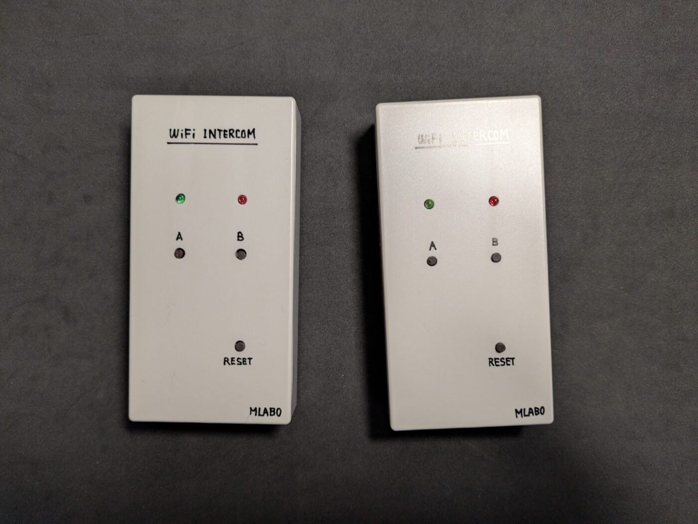 WiFiコールベルには二組のボタン、LED、ブザーが搭載されています。一方をボタン1、LED1、ブザー1とし、もう一方をボタン2、LED2、ブザー2とします。LED1は緑、LED2は赤です。ブザー1の音色は高く、ブザー2は低くしてあります。それぞれ別々に同時双方向で動作します。双方向とは、奥さんがご主人を呼ぶことも、ご主人が奥さんを呼ぶこともできるということで、ハンドシェイクするので呼んだ側は相手が応答したことを知ることができます。