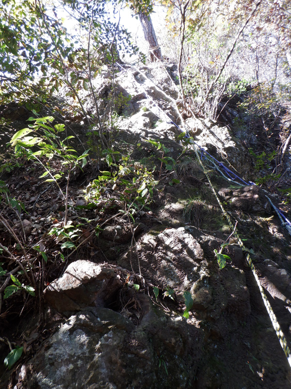 浅間山へは徐々に痩せた稜線になって、浅間山直前に5mほどの岩壁に当たります。ロープがかけられており、スタンスもあるので難なく通過できます。浅間山山頂でひと休みのあと、さらに北上しますが、左下(下仁田町側)は切れ落ちていますので、通過には要注意です。道もザレているのでスリップしないよう慎重に下ります。下仁田の街並みや、上信鉄道の下仁田駅に電車が入っていくのが見えています。
