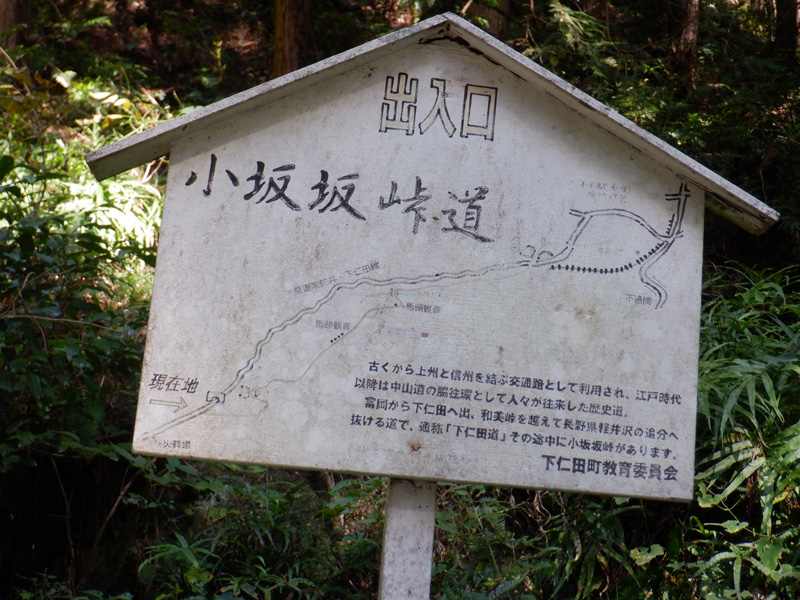 やがて道は左よりに下って、作業道に降り立ちます。落ち葉と小石が混じった歩きにくい道です。県道195号に出たら右の不通渓谷方面へ。前方にトンネルが見えてきましたが、なにやら手前に看板が立っています。見ると姫街道小坂坂峠道の入り口とのこと。計画を変更してさっそく峠道に入りました。あまり人が入っていない感じでしたが、道は明瞭です。峠は切通しになっており、傍らに天狗党が下仁田に入るときに使われた道との説明板がありました。今回行きませんでしたが、峠から赤津へ抜ける道もあるようです。