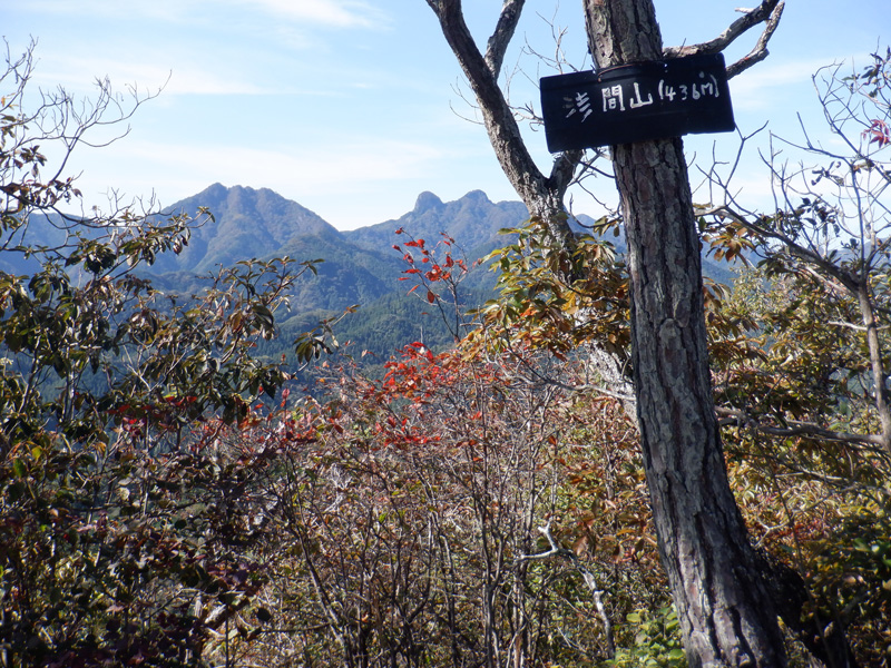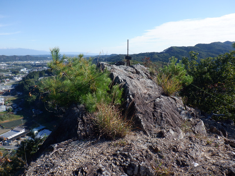 赤津の古嶽山への入り口は林道が奥へと延びる入口のところに小さな道標があります。送電鉄塔の案内杭もあるので、どうやら送電鉄塔の巡視路でもあるようです。登山口から標高差100mくらいを登ります。辺りは落葉広葉樹で紅葉すればきれいだろうなと想像しながら登りました。道は送電鉄塔の近くまで登りますが、古嶽山へはやや左側にトラバースし、再び稜線に戻ったら、先が明るくなり岩の上に出ます。古嶽山の山頂はさらに一段先です。