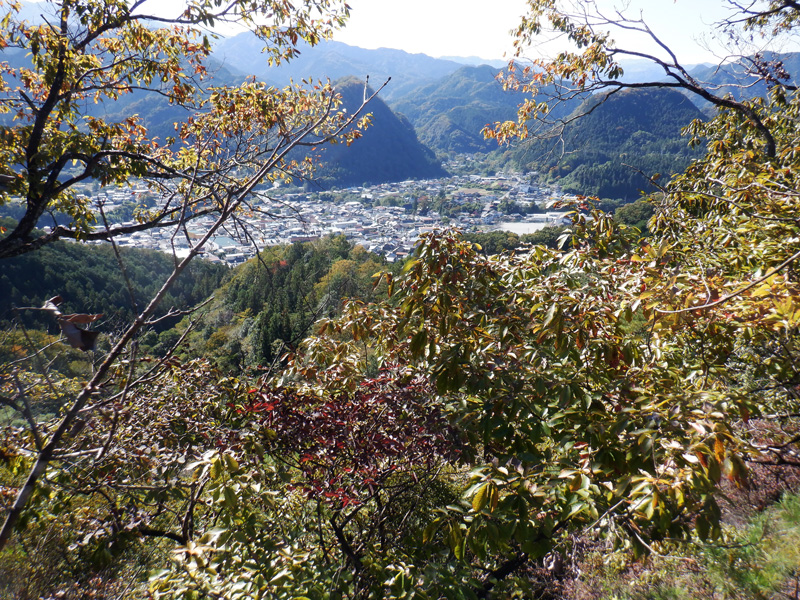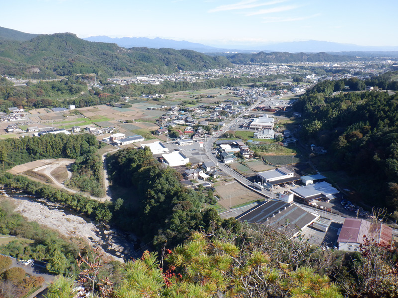 飛び込み台のような岩の上に出たら大展望が広がります。ここがあの岩壁の上かと思えば感無量です。眼下に車を置いた道の駅の円形の建物。富岡方面、大桁山、鍬柄山、富岡アルプス、遠くに榛名、赤城。近くに稲含山が高くそびえ、小沢岳、四ツ又山、鹿岳など西上州の山々が望めました。