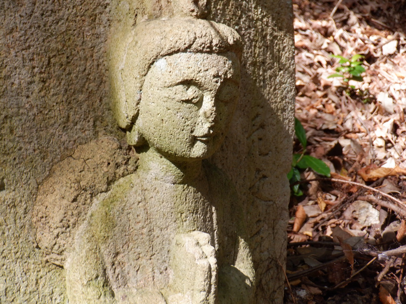 峠からは緩やかな下りになり、途中、馬頭観音が出迎えてくれます。かわいい馬頭観音に癒されながら下っていくと、すぐそこに県道が近づきます。小さな沢を渡ったあと、笹薮に阻まれて前進できなくなり、やむなく県道に出ましたが、道はさらに先まで続いているようでした。県道に出た後はのんびり農家の畑を見ながら千平から不通渓谷の橋を渡って、道の駅に戻りました。不通渓谷の河原に降りてみたかったのですが、入り口が分からなかったので、橋の上から眺めただけになりました。