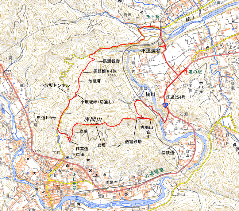 今回は下仁田の道の駅の駐車場をお借りし、国道254号を歩いて赤津から古嶽山に登り、展望を楽しんだ後稜線を北上して浅間山へ。さらに北上して作業道に降り立ち、さらに県道195号に出てトンネル手前から峠道に入りました。実は姫街道の存在を知らなかったので、そのままトンネルを抜けて千平の不通渓谷(とおらずけいこく)へ向かう予定だったのですが、トンネル手前に姫街道の小坂坂峠入口の標に気づき、予定を変更して、古道を辿ることにしました。残念ながら笹薮にさえぎられて最後まで歩き通すことができず、途中で県道に戻りましたが、多くの馬頭観音に会え、往時をしのぶことができました。