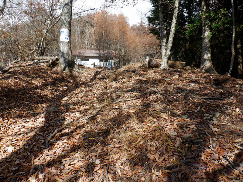 東日原には9時過ぎに到着。バスを降りたパーティーはすぐに消えていきます。我々も三ッドッケ目指してヨコスズ尾根に取り付きました。例によって最初の急登が始まります。廃屋から水利施設を見て、植林帯を登っていきます。尾根筋に乗るあたりから自然林となり、紅葉した木々からさらさらと枯れ葉が舞う中を登ります。道は尾根筋をまともに辿ることは避け、滝入ノ峰の東側を巻いて登って行きます。道はやがて尾根筋に乗りますがそこはすでに痩せ尾根で、左下は小川谷。見える大きな尾根はタワ尾根です。痩せ尾根といっても危険なところはなく、快適に歩けます。やがて稜線が近づいて、前方に一杯水避難小屋が見えてきます。ここはいつ来てものんびり感がただよう暖かいところです。