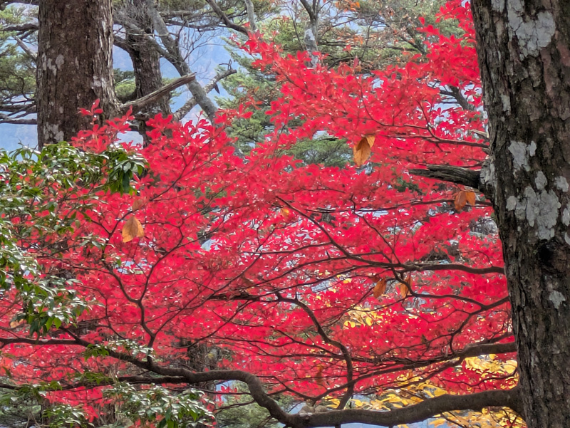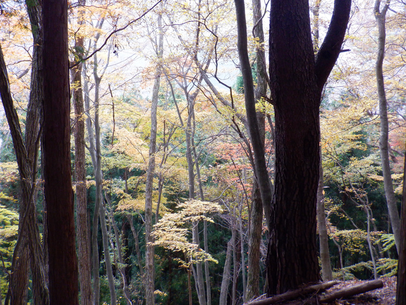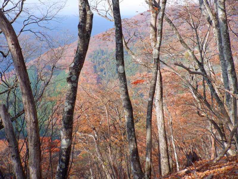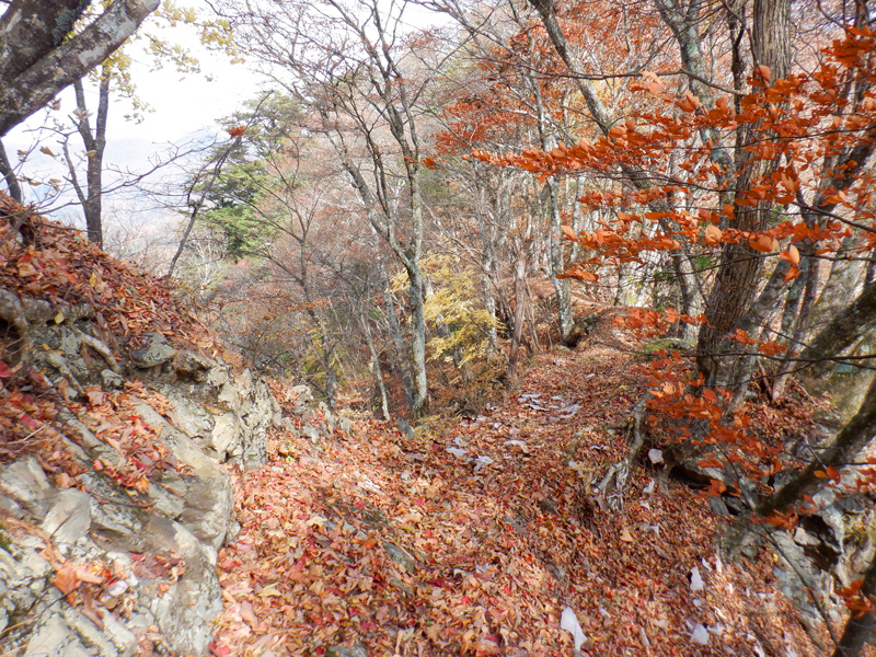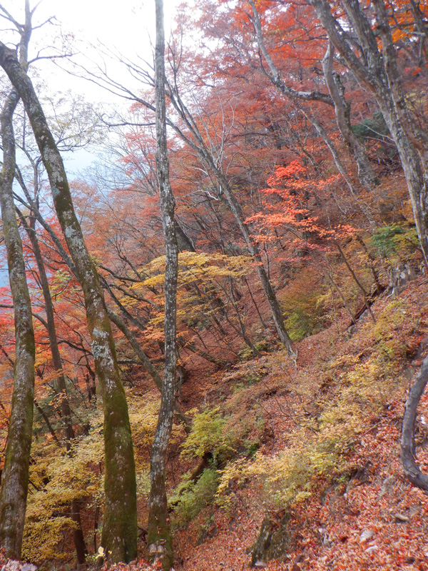 ヨコスズ尾根は植林帯が少なく、中間部が痩せ尾根になっていて快適な登りでした。危険個所はなく、自然林の紅葉を楽しみながら登りました。下りに利用しても快適と思われます。鳥屋戸尾根は長く、途中のアップダウンは疲れた体にはこたえます。下部は植林帯ですのでやや単調。この尾根は今回のように下降に使うのが向いているようです。蕎麦粒山直下の枝尾根への迷い込みと、中間部のやや複雑な尾根筋で迷わなければ、問題ありません。