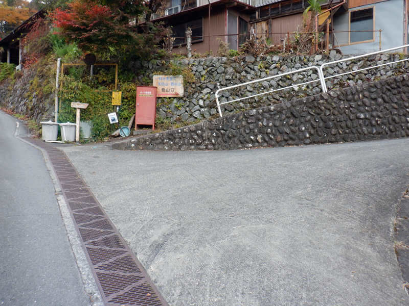 登山道入り口はバス停からやや東寄りにある(看板あり)