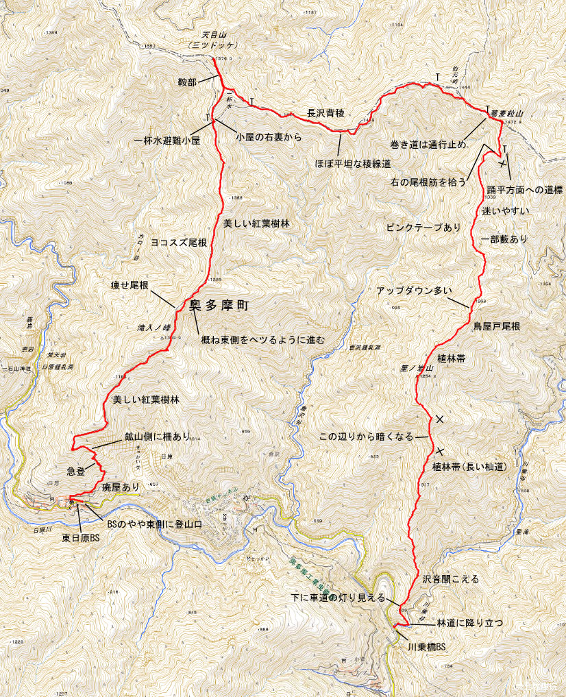 少し休憩して鳥屋戸尾根下降を開始しました。すぐ下の通行止めになっていた巻き道との合流点に道標が立っていました。踊平方面には行けるようです。我々はまっすぐ鳥屋戸尾根を下ります。すぐに右寄りの尾根を捕まえます。まっすぐ降りてしまうと枝尾根に入ってしまいます。この尾根はピンクのリボンが目印です。薄い踏み跡がありますが、尾根筋が広いところは迷いやすいようです。笙ノ岩山(しょうのいわやま)に着いたのはすでに16時前。このあたりで途中で暗くなるのを覚悟。なるべく明るいうちに高度を下げたいものです。幸い植林帯に入り、歩きやすい杣道になります。ライトで照らしながら真っ暗になった登山道を辿ります。杣道が終わると、再び岩混じりの道になり、沢音が聞こえてきます。下の道路を通る車のライトが見え隠れして、ほどなく林道に降り立ちました。少し歩けば川乗橋BSです。17時22分着。奥多摩駅行きバス17時42分に乗り、愛車に戻ったのが18時半でした。