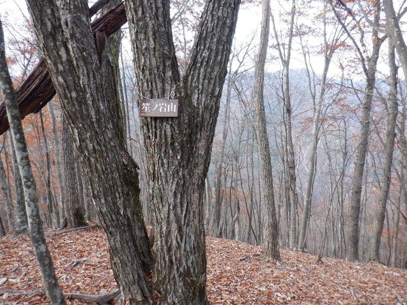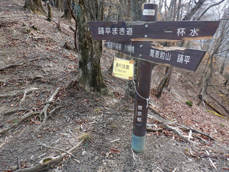 避難小屋の前で昼食をとり、三ッドッケへ向かいます。小屋の右奥から登りはじめ、最初のピークを越えていったん鞍部に降り再び登れば三ッドッケ山頂に至ります。三つのピークをもつ三ッドッケですが、三角点のあるのは最も南のピークです。あと二つのピークは北側の埼玉県にあります。晴天を期待してましたが、高曇りで遠くは見通せませんでした。もう何度か来ているピークですが、狭いながらもいい雰囲気のピークです。秋の日はつるべ落とし。あまり長居はせず、さっそく長沢背稜の一杯水近くの合流点まで下り、稜線を蕎麦粒山へ向かいます。稜線上の道はほぼ水平。急ぎ足で時間を稼ぎます。蕎麦粒山山頂はパスしようかと思っていたのですが、巻き道は通行止め。しかたなく蕎麦粒山のピークを踏みました。南に延びる鳥屋戸尾根は、道標こそあるものの通行注意となってます。