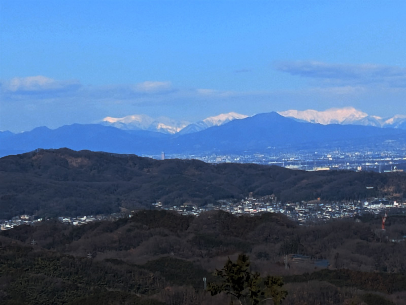 今回はメンバーの提案で、ふたつの山に登りつつも山里ののんびり歩きも楽しめるルートを設定しました。車を小川町駅に置きましたが、金勝山最寄りの東武竹沢駅まで電車で移動し歩き始めました。しばらく東武線の線路と並行して歩きますが、道標に従って山道へ入ります。しばらく登ると展望のよいピークに出て眼下にホンダの大きな工場が見えますが、山頂はすぐそこです。金勝山の山頂には二等三角点 勝呂があり、標高263.44mです。勝呂(すぐろ)は南麓の地域名です。山頂からは関東北部、上越の山々が見えています。南の都心側にはうっすらスカイツリーも見えるようです。