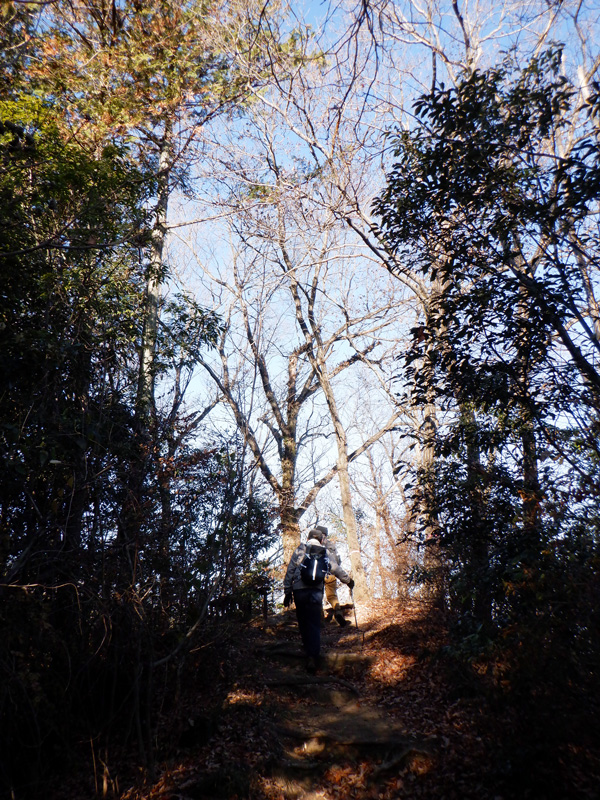 熊谷から江南、嵐山町へと車を進めると小高い丘陵地となり、この時季であれば冬枯れの林が覆う穏やかな曲線を描いています。田畑の中に点々と民家があって、のどかな風景が展開します。比企丘陵です。車を小川町に進め、東武小川町駅前の有料駐車場に停めました。埼玉県比企郡小川町は、この辺りの山に登るときの起点となります。選んだのは小川町に近い金勝山(きんしょうざん)と官ノ倉山(かんのくらやま)。新しい年が明けて初めての登山は、山仲間が三人集まっての日和見登山となりました。比企には比企三山の笠山、堂平山、大霧山がありますが、それらを含む外秩父七峰には官ノ倉山が含まれています。金勝山ともにいずれも展望のよい山で、低山ながらも登り甲斐のある山です。