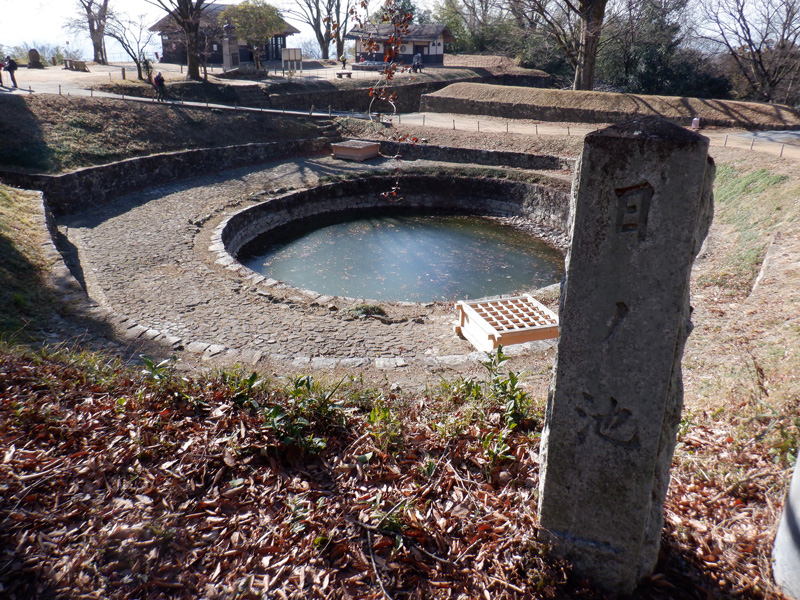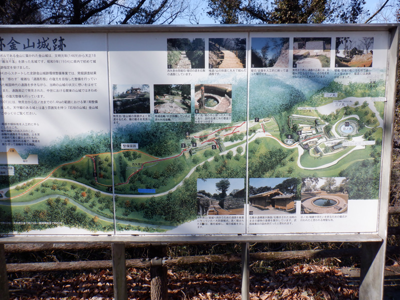 金山城址はすこし変わった城跡で、山頂部にくぼみがあり、そこに日ノ池、月ノ池という二つの丸い池があります。城の水源でしょうか。南側には関東平野が広がっています。トイレや休憩所が整備されています。城址の石垣(復元したものと思われる)、遺構がはっきりわかり、ジオラマもあって往時の様子がよくわかります。各遺構の近くの説明版があってわかりやすく案内してくれます。物見台に立てば金山の北側(渡良瀬川側)がひろがり、その奥に赤城山や榛名山が展開します。