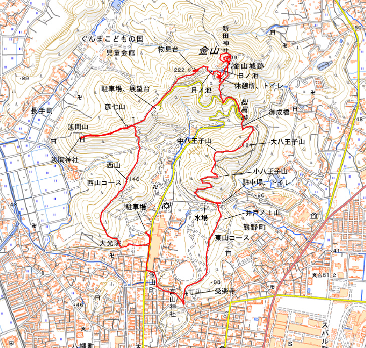 東山コースで登り、金山城址を見学後、浅間山に寄って大光院へ降りる
