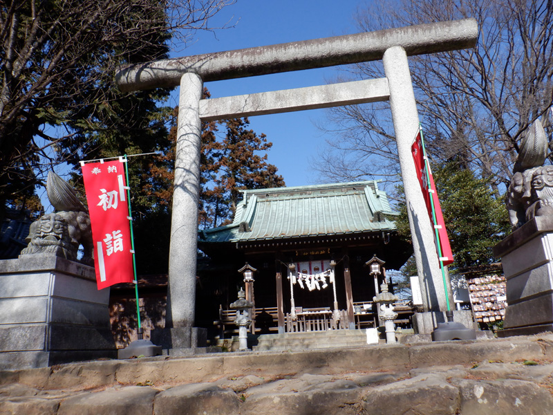大八王子山から少し下ると先ほどのトラバース道が合流し、ほどなく御成橋です。橋の下は車道です。渡ってすぐ上に車道が近づきますが車道を歩くことはなく山道を進みます。東屋の上からは溶結凝灰岩の坂道となり、鳥居が見えてきたら金山城址の一角です。まっすぐ進んで新田神社に参拝しました。新田神社は金山城の本丸の位置に鎮座しています。標高240mながら見晴らしの良い山頂です。本丸の一段下をぐるりと廻ることができます。本丸の裏側に古い石垣が残っています。