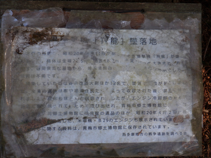 梅ノ木峠手前に戦時中、重爆撃機の「飛龍」が墜落した現場を示す説明板(下に画像あり)がありました。この事件は青梅市の郷土博物館(現在休館中)に展示されていますが、その説明板にはこのように書かれています(一部読み取れない部分があります)。この事故で12名が亡くなったようです。