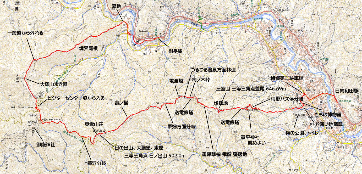 境界尾根の末端は吉野街道の民家の横に出ます。すぐ近くが御岳山への入口の大鳥居です。その前に細い道が河原へ向かって降りており、吊り橋で対岸に渡ります。車道には出ず、河原の遊歩道を歩いて御岳駅に向かいました。御岳駅からJR青梅線で日向和田駅まで移動。梅郷の駐車場に戻りました。