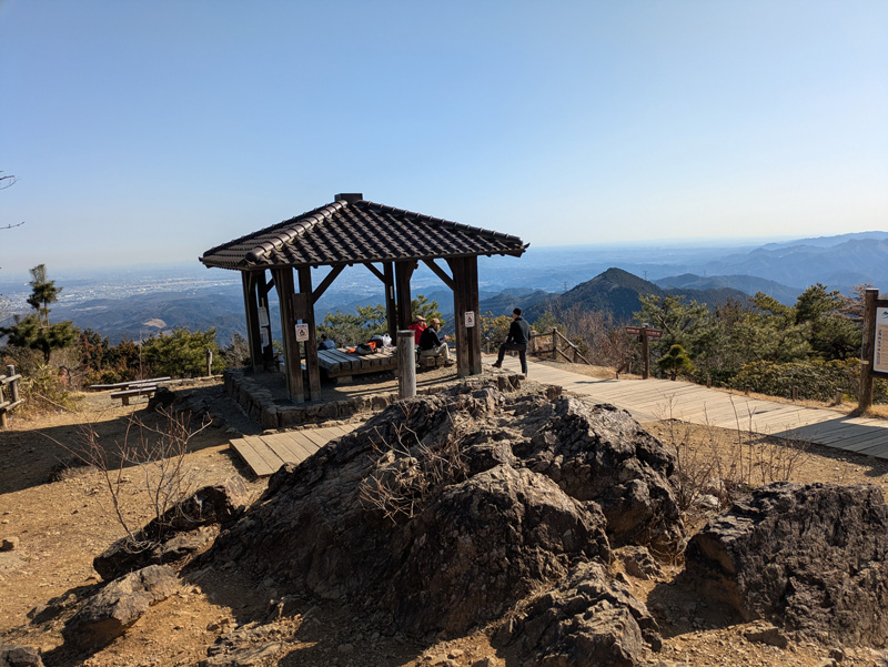 日の出山直前はなにやら城跡のような石垣になっています。石段を登ればそこは別世界。大展望の日の出山山頂でした。よい雰囲気の山頂で、東屋があり、360度の展望です。よくありがちですが、若い三人組が大声で話をして、山頂の雰囲気がぶちこわし。なぜあんな大きな声で会話するのでしょうか。しかもどうでもよいような話ですから、降りてからやってほしいものです。それでもゆっくり昼食をいただき、眺めを堪能しました。これから向かう御岳山がすぐそこに見えています。