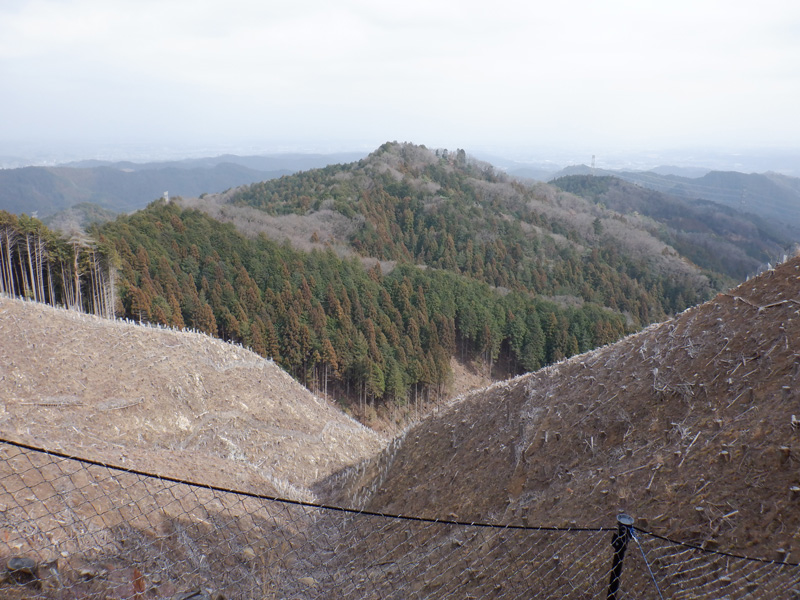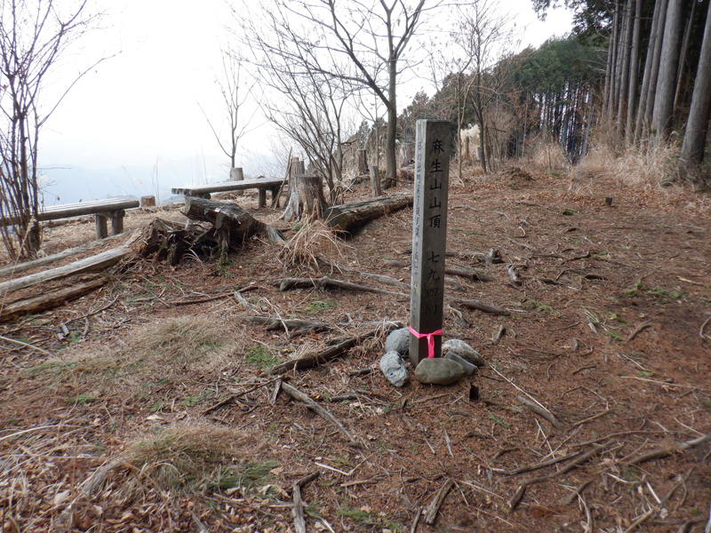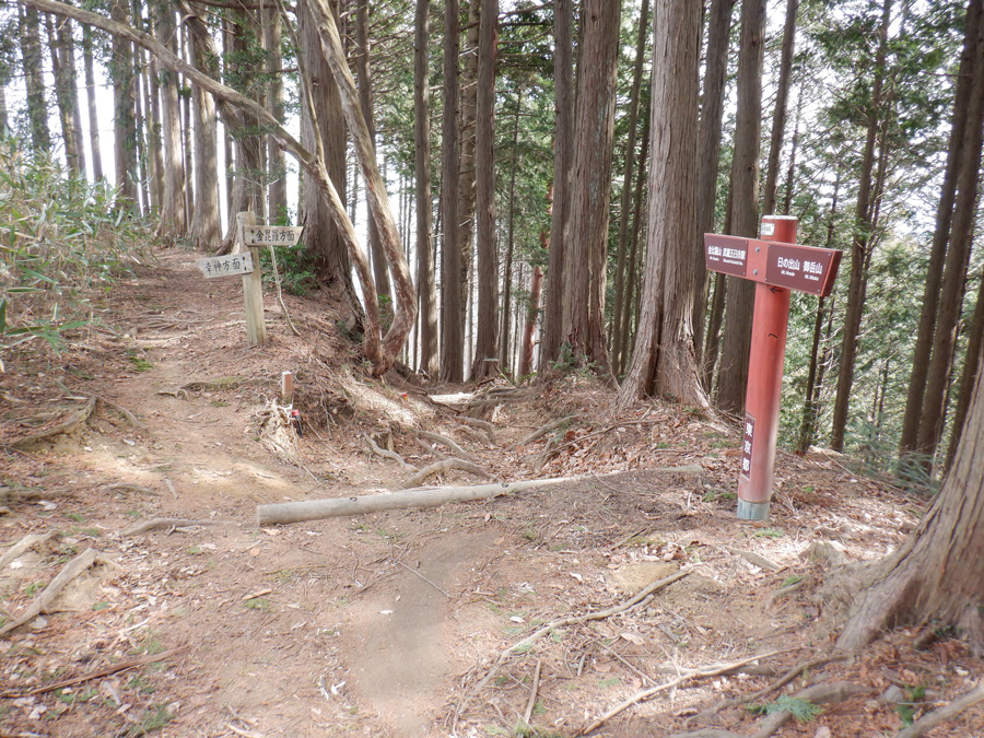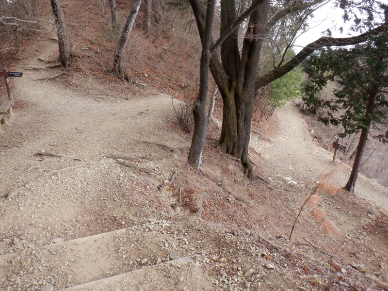 さすがに山頂は人が多く、みなさん思い思いに昼食をとっています。まだ11時過ぎでしたが我々も昼食を済ませました。十里木への下山に使う金比羅尾根には山頂から直接入れます。急な階段を下りるといくつか道が合流していささか複雑です。長い階段もしつらえられています。つるつる温泉への道を分けて麻生山へ向かいます。金比羅尾根は長い下りになりますが麻生山の手前は少し登りになります。麻生山の山頂は関東平野側が開けてよい展望です。山頂から少し南側に降りたとこが露岩帯で滑りやすい急斜面です。全体的に尾根筋はあまり高度を下げないため、その分長大です。尾根の大半は杉などの植林帯ですが、下部は自然林です。自然林に入るととたんに野鳥のさえずりが聞こえてきました。