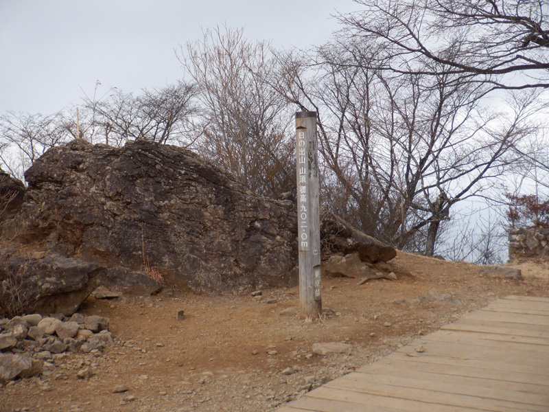 林道を尚も奥へ進むと途中に右上へ登る分岐があり、道標が大野坂、御岳山を示しています。林道はさらに奥へと続き御岳山直下の七代ノ滝付近まで行けるようです。道標に従って大野坂方向へ入ります。すぐに登山口がありました。最近どこでも見る「クマ出没注意」の看板。斜面は急ですが、道は電光につけられており、さほど急な感じではありません。40分ほど登ると傾斜は緩みピークを避けながらへつるようにつけられた道が御岳山の鳥居までつづきます。鳥居のある御岳山と日の出山を結ぶ道に出たら右へとり、階段の多い道となり東雲山荘が見えてきます。トイレを済ませて石段を登ればそこは大展望の日の出山山頂です。残念ながらこの日は曇りであまり遠望は利きませんでした。これから向かう麻生山が見えています。