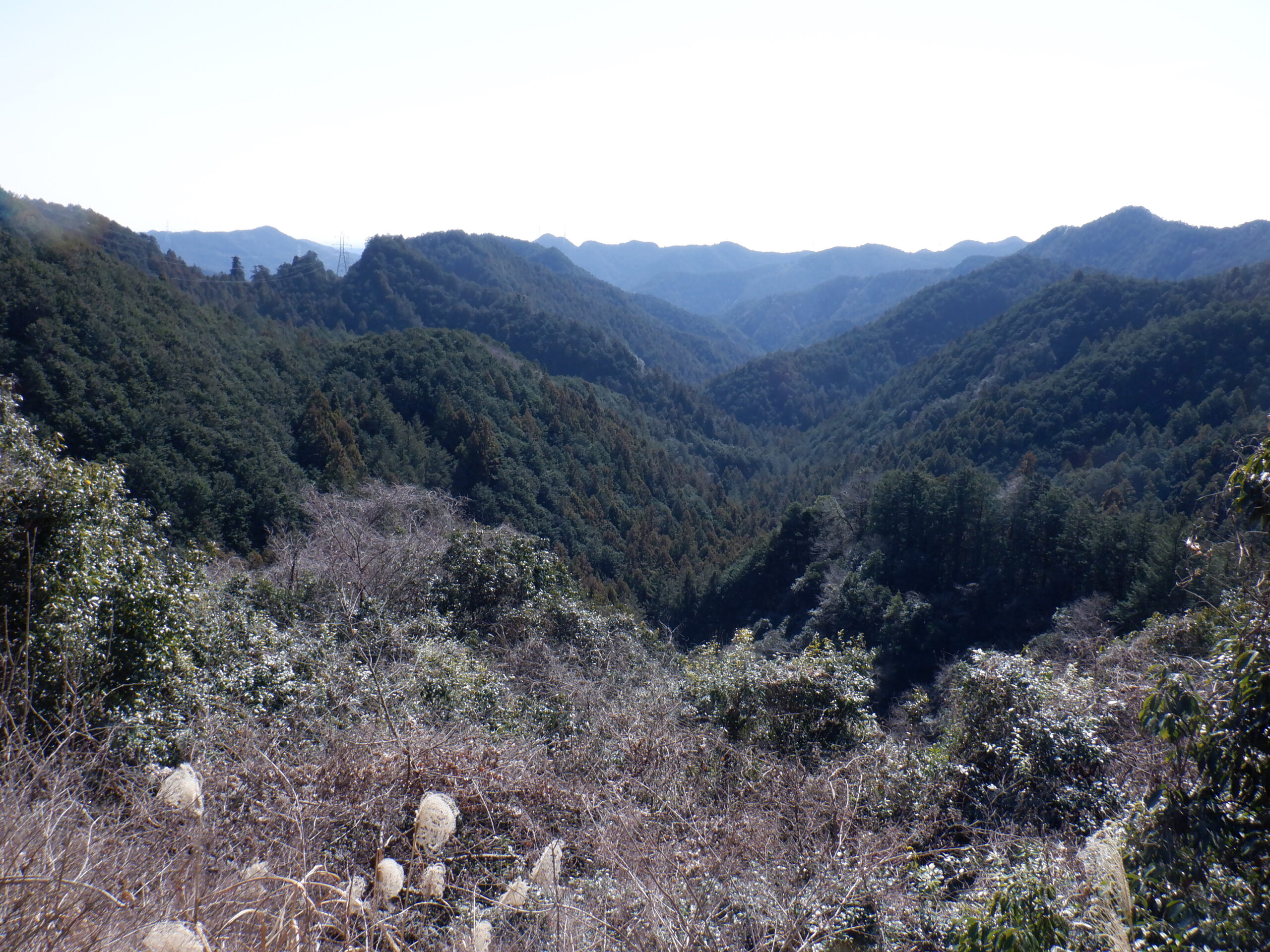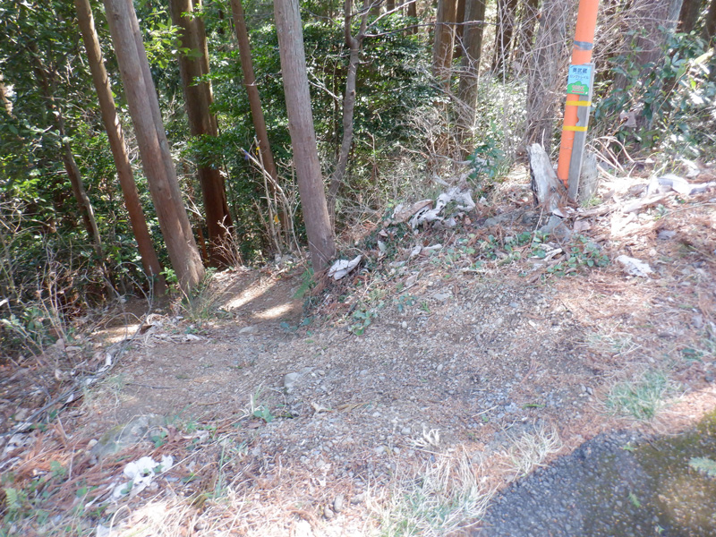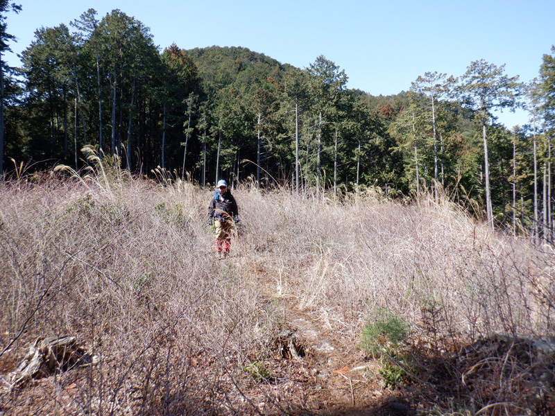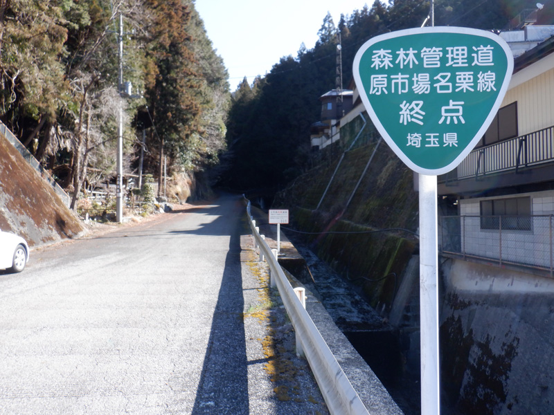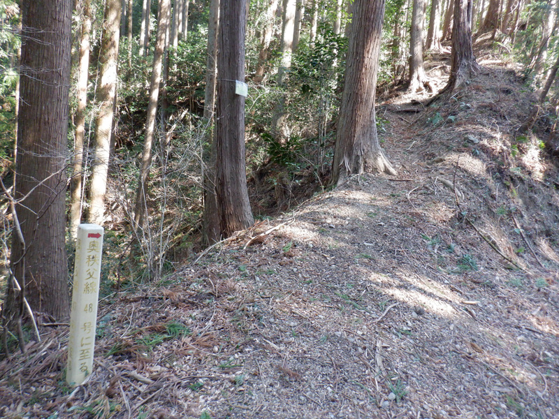 今回我々はそれらには登らず、どちらかというと地味な山域を選びました。さわらびの湯に近い駐車場をお借りし、林道原市場名栗線で仁田山峠へ向かいました。仁田山峠からは竹寺へ行けますが、今回はそのまま林道を歩き続けました。さわらびの湯から約4km。道端に「奥武蔵ロングトレイル105K」の目立たない道標がありました。急斜面を少し降りると良い道が現れました。さすがにロングトレイルの一部。よく踏まれています。ここから原市場まで地味な尾根道ですが、明瞭でした。