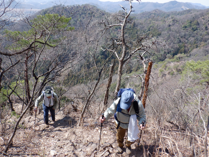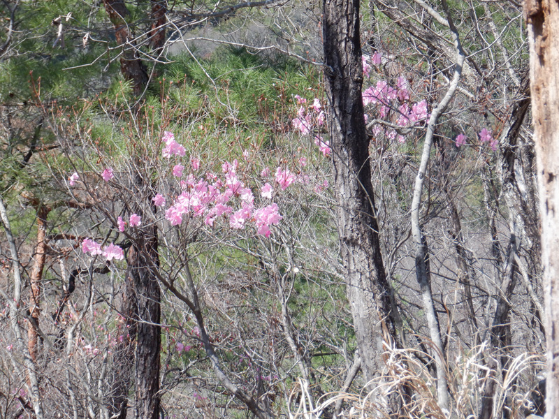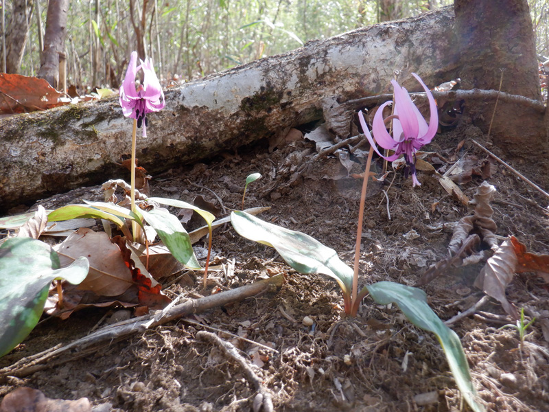 前述のようにいたるところに露岩があり、要所要所にクサリがかけてあります。ザレた急斜面が多く、チャートは鋭くとがった角があるので、スリップして頭でも打とうものならそのままあの世行ともなりかねません。気を抜かずに歩くことが大事です。とくに下りのザレ場は要注意です。ヤシオツツジは以前より減ったように思いますが、桜山までの稜線沿いに点々と咲いていました。桜山の次の一床山までの間は一旦大きく下ります。最低鞍部に達すると沢筋を渡って一床山へと登り返します。今回のルートで最も深いアップダウンです。しかし、この最低鞍部にはカタクリの花が咲いています。大きな群生地ではありませんが、ところどころに可愛い花を持ち上げています。登り返すと一床山です。