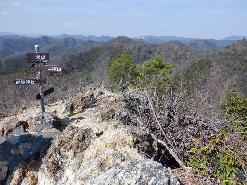 一床山は最も展望のよいピークで、360度の展望を楽しめます。ただし一床山からつぎの二床山へ向かう稜線は要注意。露岩の急斜面を慎重に下らなければなりません。二床山に立てば次の高松はすぐそこですが、やはり露岩だらけ。二床山から少し三床山側に下ったところにある踏み跡とロープに従って高松へ向かいます。高松は主稜線から南に外れたピークなので、一床、二床、三床山の稜線と岩壁がよく見える位置にあります。高松で一服したらあとは鹿島神社の駐車場までひたすら下ります。常緑低木のサカキのトンネルですが、この時季ただようサカキの花の匂いはあまりよい匂いとは言えません。道が笹薮になったら駐車場はすぐそこです。