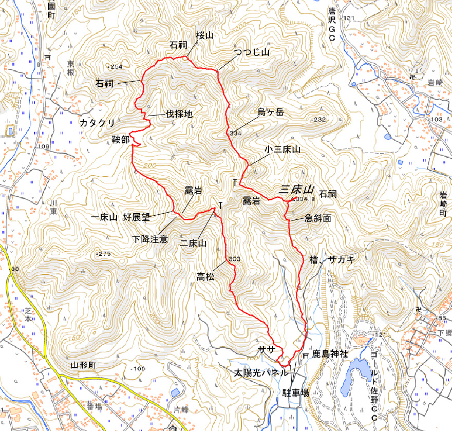 さて、三床山の場所ですが、ラーメンで有名な栃木県佐野市の奥。田沼町です。山懐に鎮座する鹿島神社の手前の駐車場をお借りして登りました。ルートはいくつか取れますが、一床山(ひととこやま)、二床山(ふたとこやま)と三床山の三つを辿るのは定番ですが、少し奥に足をのばして桜山までを往復してもそんなに時間はかかりません。今回は反時計周りに鹿島神社から、まずは三床山に登り、小三床山、烏ヶ岳、つつじ山、桜山、一床山、二床山、高松と辿る周回コースとしました。名前のないピークも含めると10個ほどの小ピークをアップダウンするので、距離のわりに疲れるかもしれません。