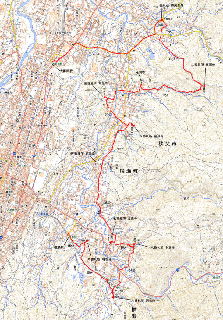 札所一番 四萬部寺に車を置き、九番 明智寺のあと横瀬駅から電車で西武秩父、御花畑駅から大野原駅